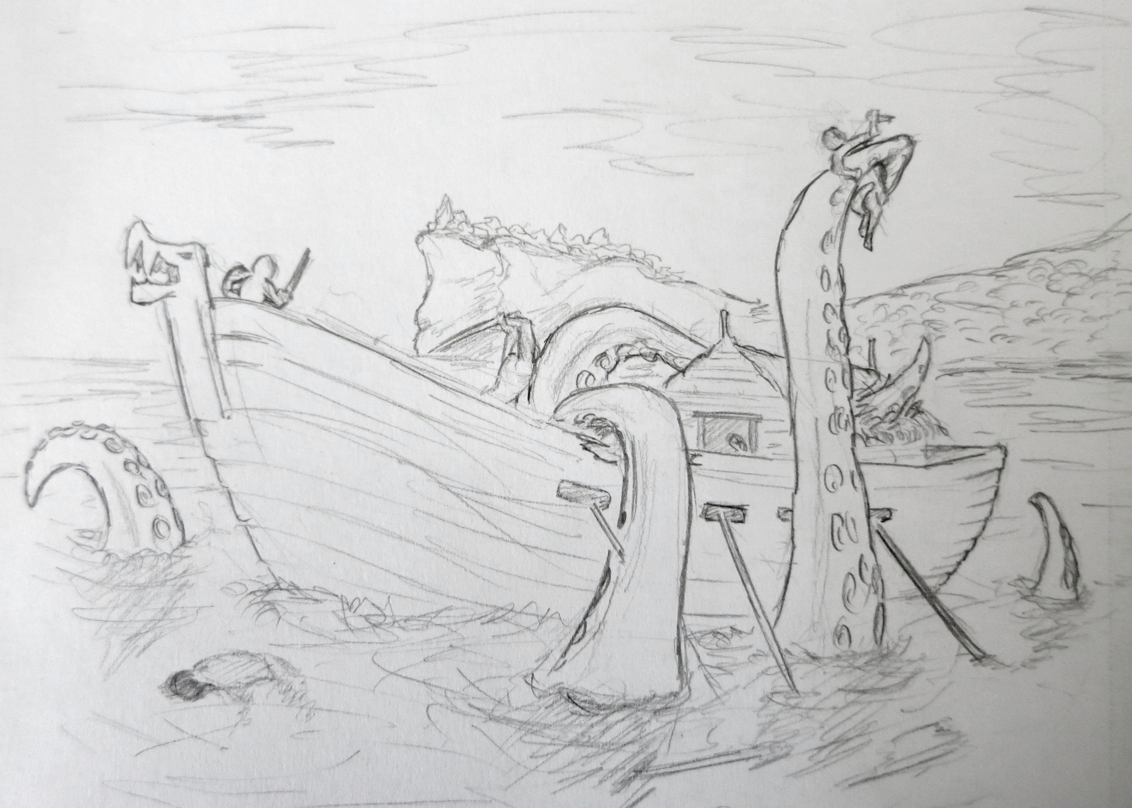 First up we have two pictures showing some of the original concepts I did around the idea of a port town with a chequered past and the fantastical creatures and goings on in the world: