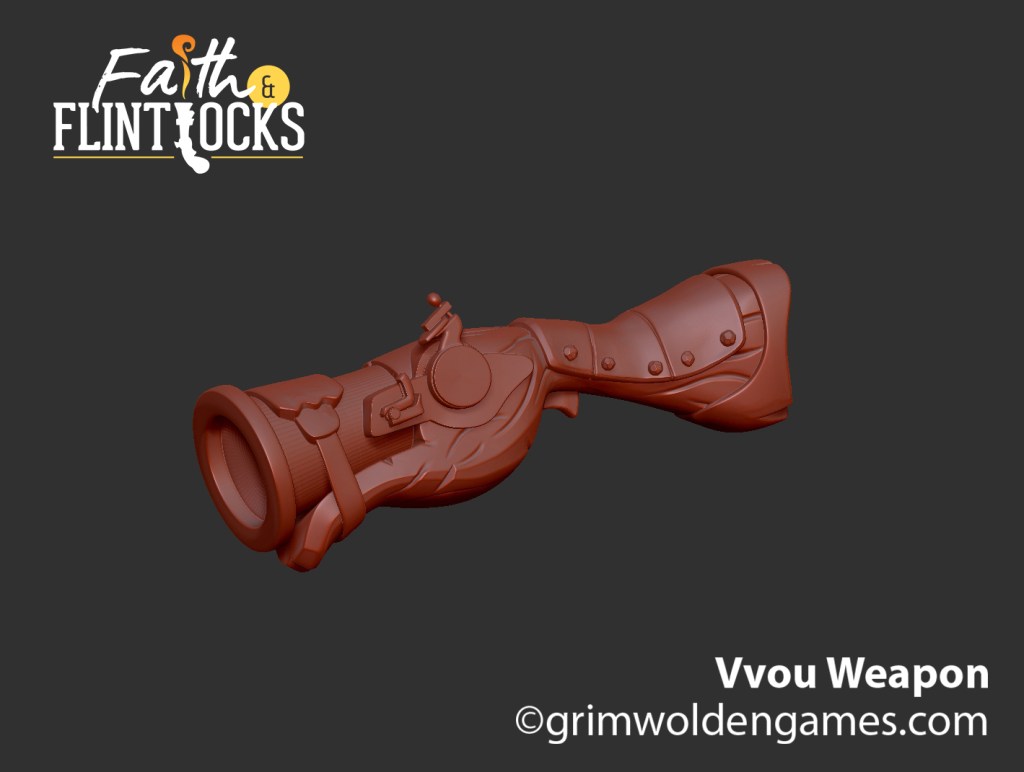 Also worked on this week was the vvou’s blunderbuss. Its all done and dusted though I’ve forgotten to take a finished render of it, but I did snag one of it in progress. As you can see its looking snazzy and the finished version has the flintlock mechanism thicker and better suited for miniatures.